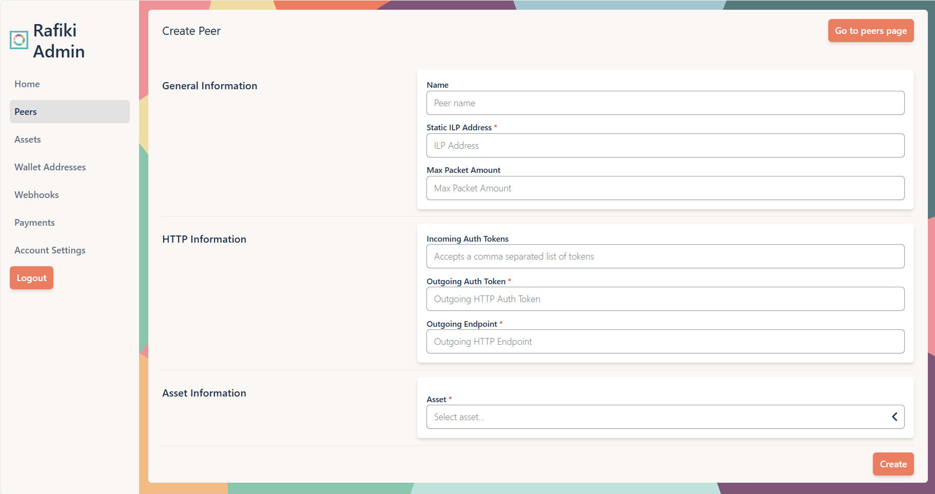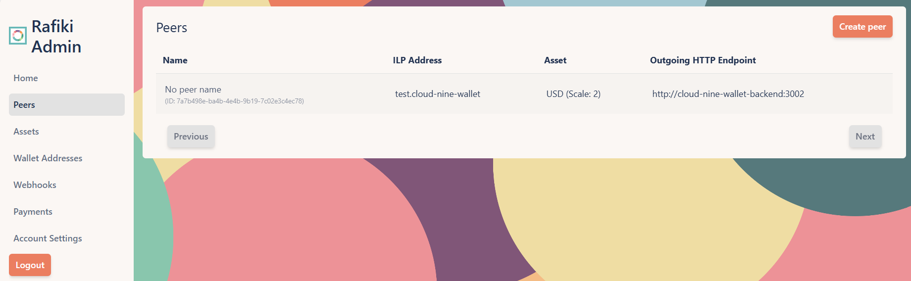 The Peers page allows you to manage peering relationships in your Rafiki instance, including viewing, creating, editing, and deleting peers.
