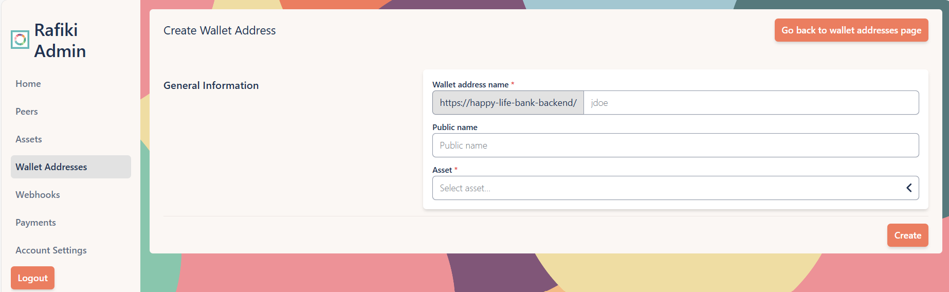 To create a new wallet address, select Create wallet address from the main Wallet Address page.