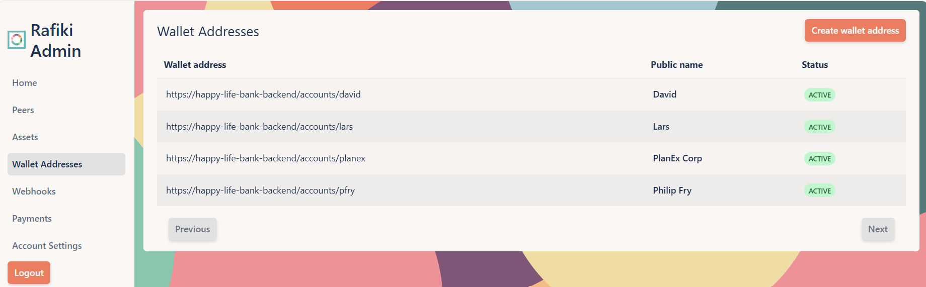 The Wallet Addresses page allows you to manage the wallet addresses associated with your Rafiki instance, including viewing, editing, and creating wallet addresses.